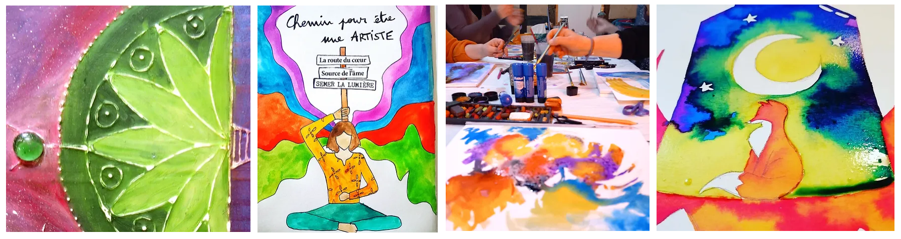 Je propose un espace de création sans attente, sans recherche de productivité. Un espace de liberté où simplement expérimenter et faire vivre les couleurs. J'accompagne dans la bienveillance afin d'explorer le potentiel créatif de chacun.